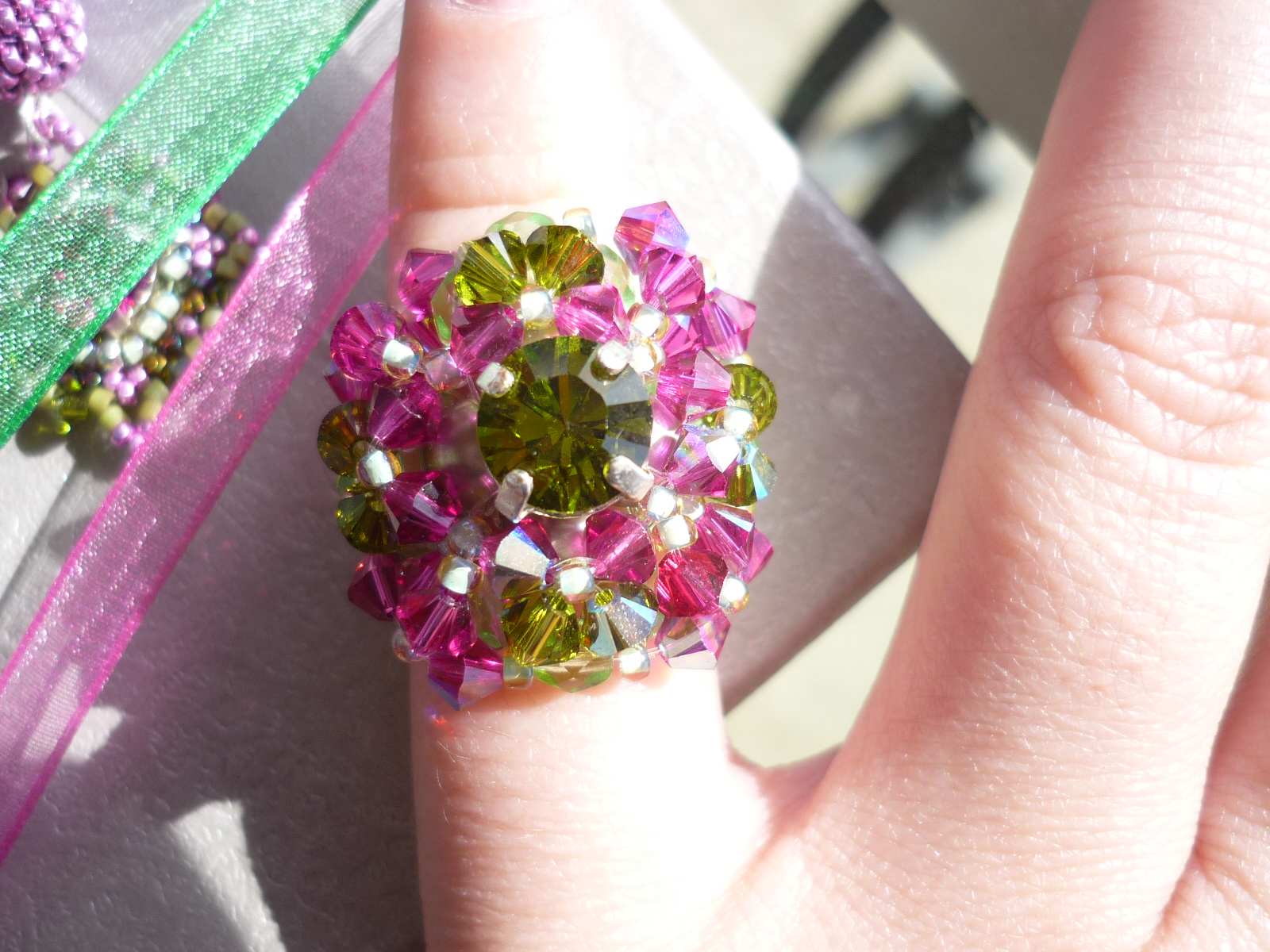 Un conjunto con mezclas de tecnicas tipo Biloba y el cosido basico de los anillos, siempre con cabujones de ocho que era de lo que queria que se centrase. Los colores....Rafi es una persona alegre y le gusta combinar cualquier color, pero siempre colorido y alegre..asi que en vistas a la primavera que mejor que el fuchsia y el verde! La verdad que el resultado quedo super vistoso y ella quedo encantadiisima con el regalo, Rafi, me alegro que te gustase tanto!